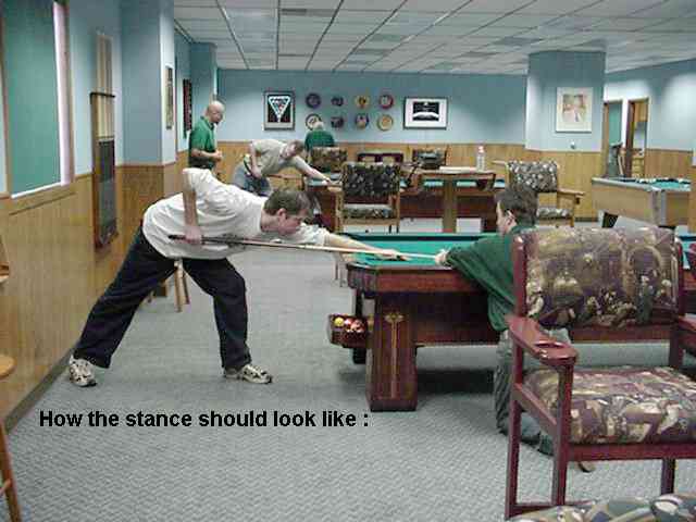The Basic stance is illustrated by the 2 pictures above. The Stances are very well but not for everyone. The feet are a comfortable distance apart with the feet aiming approximately 35 to 40 degrees this stance allows the body to turn just right for the cue.